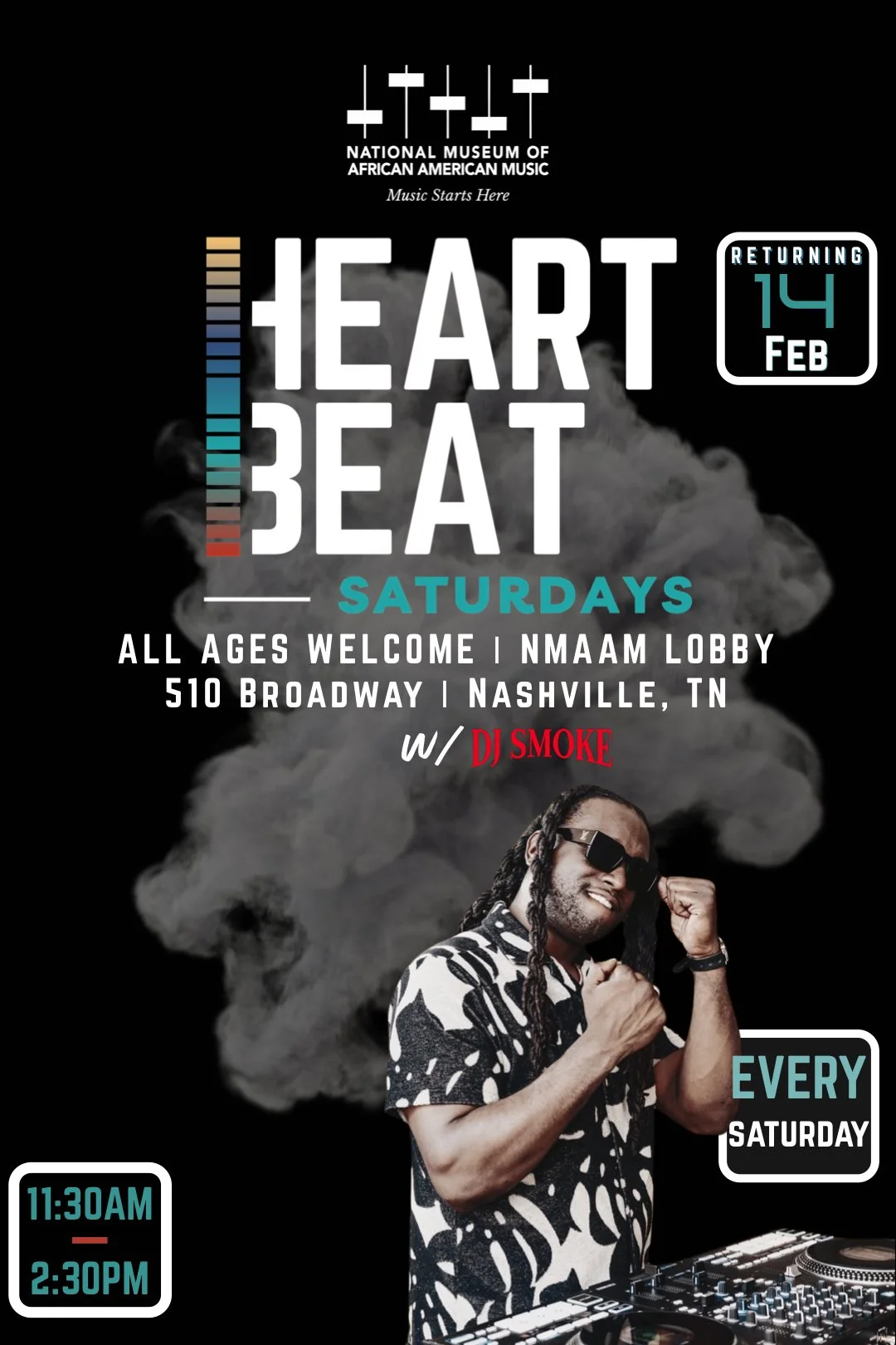 DJ Smoke is the resident DJ at the National Museum of African-American Music in Nashville, TN. Join us every Saturday in the NMAAM lobby from 11:30 AM to 2:30PM for HeARTbeat Saturday, a curated event that is open to the public. Experience vibrant music and community engagement. We look forward to welcoming you at NMAAM on Saturday!